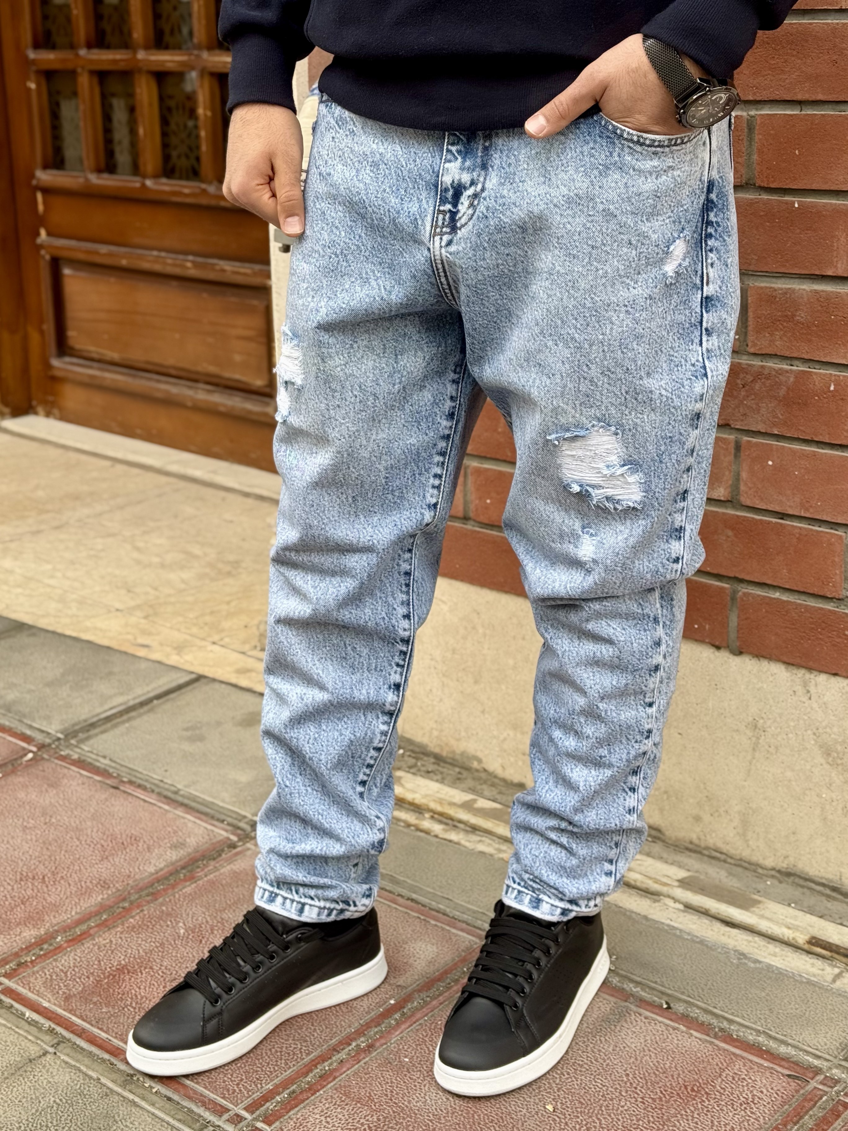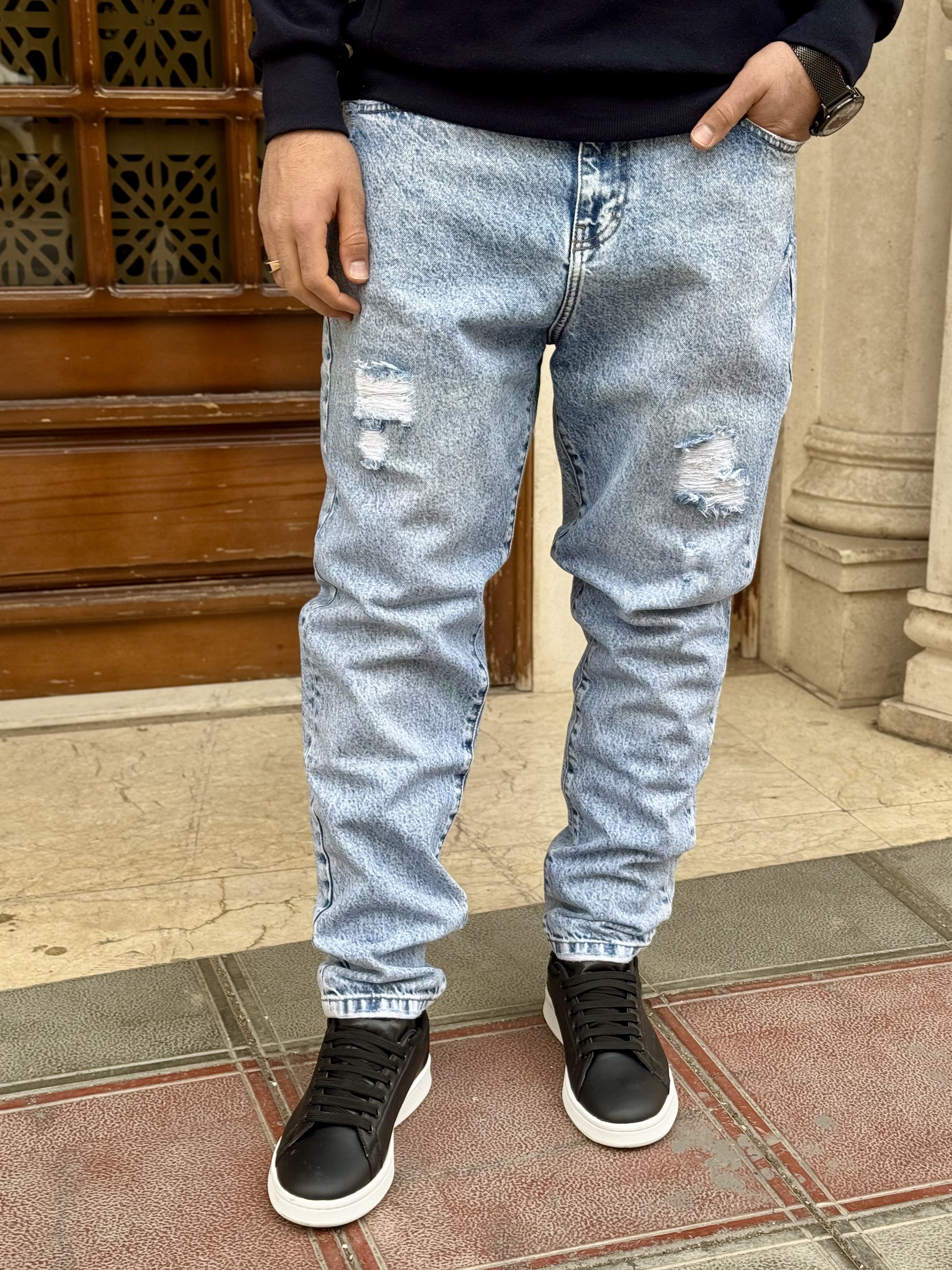 شلوار مام استایل زاپ دار روناک جین آبی روشن